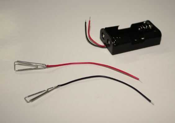 1. en vez de poder el kit con las pilas, van a cortar algunos hilos de la longitud de la batería que viene con el kit de TV-B-Gone y luego soldar un conjunto clips en las longitudes de cable, como en la imagen. Mantener la batería para probar al ensamblado antes TV-B-Gone de insolacióny para futuros proyectos.
