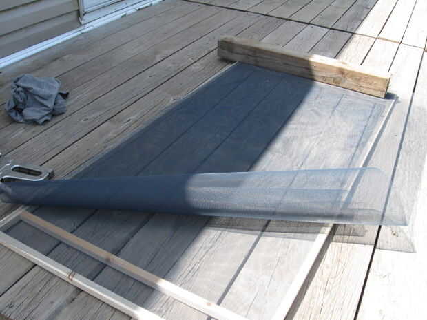Ahora, poner el rollo de pantalla de la ventana negra sobre el marco, usted puede necesitar un ayudante o un trozo de madera para sostener un extremo de la pantalla para evitar que se ruede hacia atrás para arriba como usted trata de trabajar con él. Vas a cubrir todo el lado del marco con dos capas de la pantalla. La primera capa sólo necesita unas grapas para sujetar en su lugar. Si la pantalla es más grande que el marco, deje suficiente espacio entre la grapa y donde hay que cortar para que pueda obtener sus tijeras y mano allí para cortar, luego virar hacia abajo después del corte.