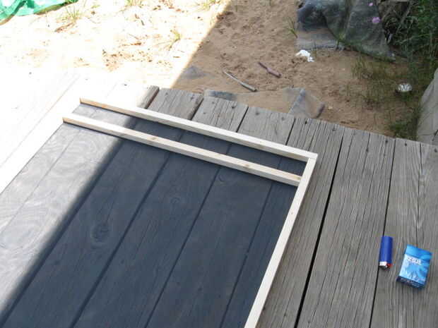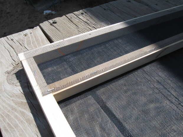 Ya que estamos trabajando con la pantalla de la ventana, vamos a voltear nuestro marco y coloque una capa de pantalla a lo que será el orificio de salida superior. Esta pantalla es necesaria para evitar que la válvula de aleta sea absorbido por el marco en la noche. Esta pantalla proporciona un sello de la válvula de aleta para que por la noche cuando es refrescarse, el aire caliente no dibujado en el colector solar y vertido hacia fuera del respiradero de la parte inferior como aire frío.