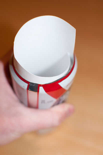 Suavemente enrolle el papel, el lado brillante e inserte en la lata. El pedazo de cinta aislante que coloca anteriormente ayudará a alinear el papel para que no se cubre por el agujero de alfiler. Utilice unos trozos de cinta aislante para fijar el papel al interior de la can y mover la pieza de la cinta que cubre el agujero de dentro de la lata hacia fuera, otra vez cubriendo el agujero de alfiler.