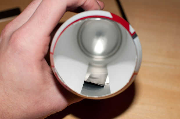 Coloque la tapa cortar antes sobre el extremo abierto de la lata y la cinta de la costura con unas vueltas de cinta aislante.