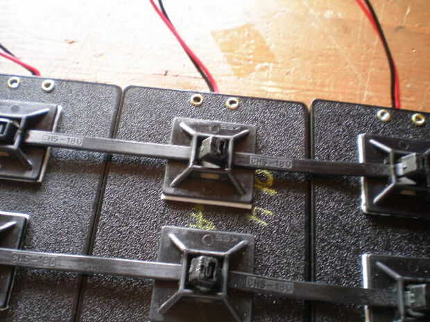 -Utilice sujetacables de nylon del tamaño correcto para los paneles de encaje juntos. La "cabeza" de las relaciones va en medio de las teclas. Esto fija la posición de los pequeños paneles solares.
