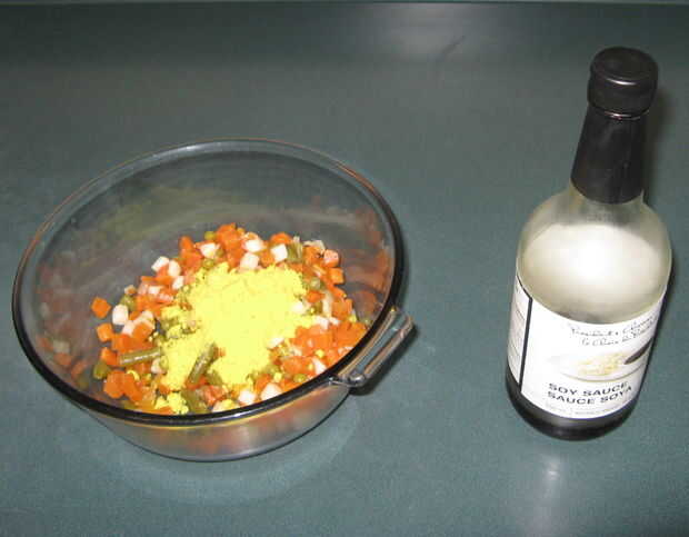 Para un plato de lado hice mi arroz de pollo con sabor a cocido en el microondas, en un tazón grande de un litro agregue una taza de verduras al vapor en cuadritos, una onza de salsa de soja, dos tazas de arroz y 4 tazas de caldo de pollo caliente. Para esto utilicé dos mesa cucharas sal pollo en polvo gratis caldo y cuatro tazas de agua caliente. Establecer el microondas en alto durante cinco minutos, cuando el temporizador va de revolver los ingredientes y restablecer el microondas en alto por cinco minutos. Calentar el arroz cuatro veces y luego dejar reposar cinco minutos antes de servir.