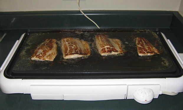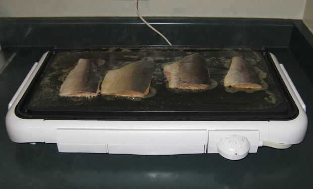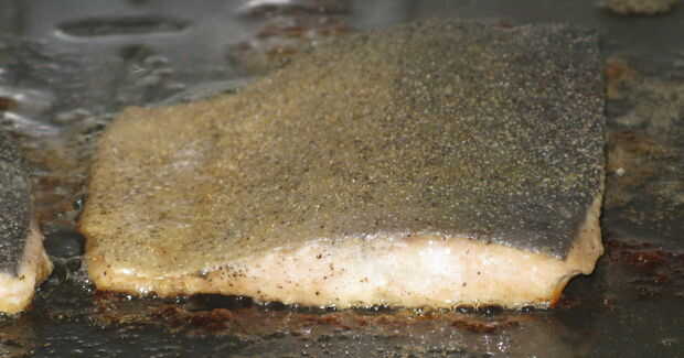 Después de haber revuelto el arroz y restablecer el microondas por cuarta vez, coloque los filetes en el lado de la plancha con especias hacia abajo. Espolvorear la parte de la piel de los filetes con pimienta negra y ajo en polvo y parrilla hasta que el pescado esté cocido a medio camino a través de la carne es de color blanco con una espuma blanca en el borde cocido y esté ligeramente dorado. Los filetes deben estar listos a entregar al mismo tiempo tomar el arroz en el microondas y dejar reposar cinco minutos. Una vez han soldado al lado de la carne Voltee los filetes y cocina mientras que el arroz está de pie. El arroz y el salmón soldado debería estar listo para servir al mismo tiempo.
