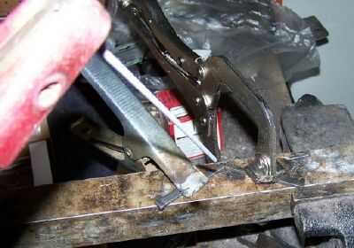 Soldar piezas pequeñas en un pedazo de ángulo de aluminio sujetada en un tornillo de banco. El aluminio me permite soldar piezas pequeñas y quita exceso de calor que provocaría la pieza a fundir y sople. Colocar dos clavos de punta a punta en un ángulo asociado con un techo de cobertizo. Soldar junto ligeramente. No necesita mucha fuerza. Al mismo tiempo, alejarlo la escoria antes de alterar la configuración para asegurarse de que no hay fusión entre las dos piezas.