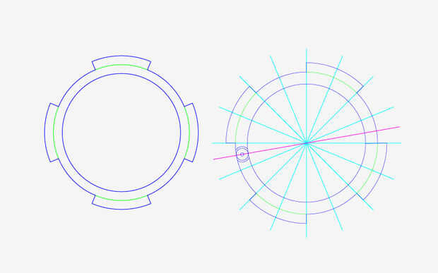 elegí un punto de los anillos por debajo de uno de los bloques que se extienden fuera de los aros y puso un punto pivote donde le abra los puños. y enfrente de el un corte donde se abrirá. decidí ponerlo cerca del bloque para ocultar la línea cerrada.