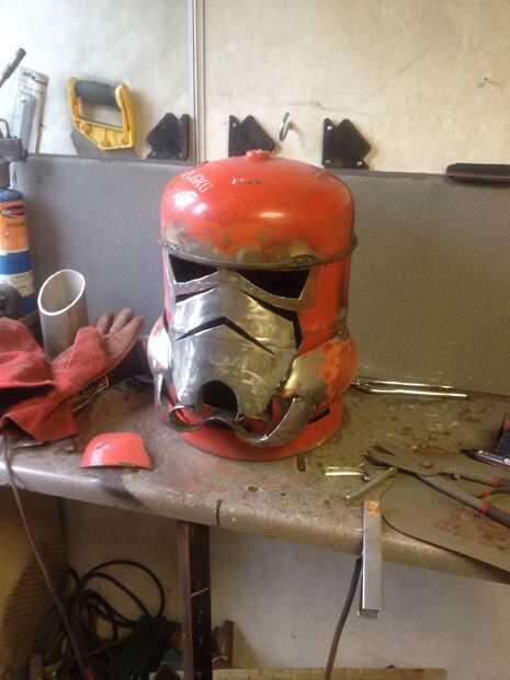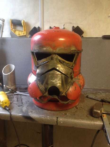 La parte superior de las mejillas en el casco otra vez estamos hechas de secciones de la botella de gas grande, viró la convence y dónde ir con mi martillo. Usé mi amoladora una rueda de paleta la aleta para moldear las piezas alrededor de los bits de andamios doblado en el frente.