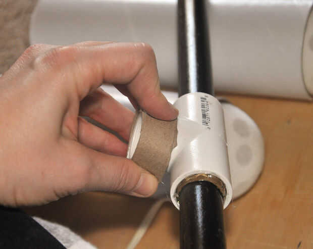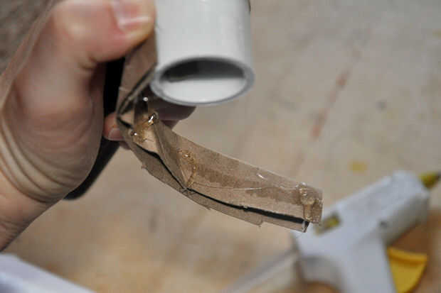 5. El ajuste entre la pieza de PVC y la botella no puede ser ceñido. Opción, cortar el papel de otro rodillo pieza y pegamento caliente alrededor del extremo del PVC sobresale de la culata de fusileros en el cuadro #6 y #7. Una vez que el pegamento ha refrescado y establecido, pegamento caliente otra vez alrededor papel de rodillo pieza Coloque la botella en el PVC y papel de rodillo pieza y deje que el pegamento fresco y conjunto.