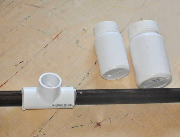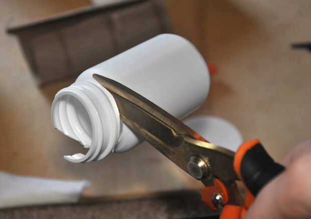 4. -Tomar dos botellas de plásticos de la píldora y cortar la tapa que se muestra en la foto #5. Esto es para asegurarse de que se ajusta alrededor de la pieza de PVC y también para deshacerse de la rosca.