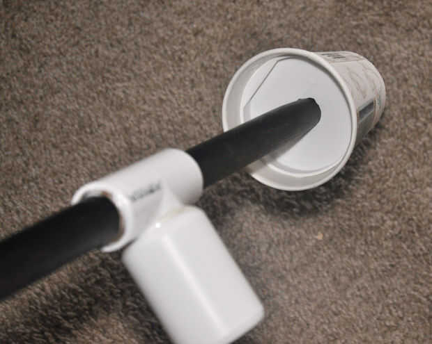 7. Por último, caliente pegar el agujero en la tapa papel taza y coloque un extremo de la encuesta de madera en la pieza de la taza. Deje que el frío del pegamento y conjunto y Wha-la. Culata haya terminado.