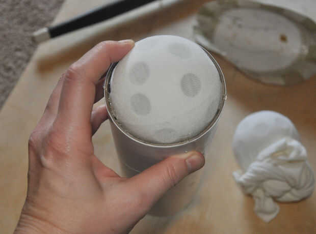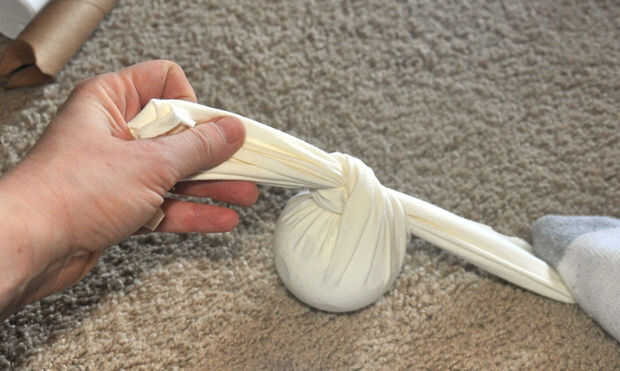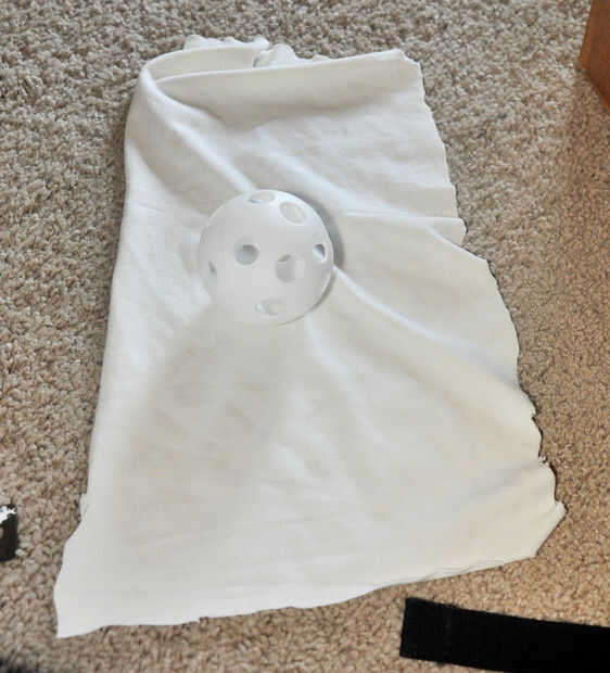 - Bola de wiffle de lugar en medio de las tela y lazo de tela alrededor de la bola en un nudo. Repita con la segunda bola.
