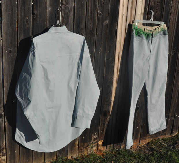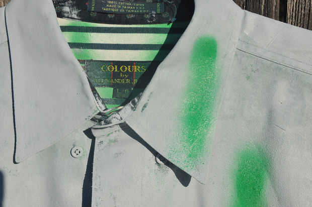 - Compraron un 1 cuarto de galón de pintura interior gris para ajustar a la tela de la camisa y los pantalones y seguir con la pintura verde en aerosol. Funcionó muy bien. Lo que debería haber hecho: Tomar 1 lata de pintura verde en aerosol y rocíe una pequeña tarjeta blanca. Tomar esa muestra de pintura y conseguir a un partido de color para un cuarto de galón de pintura de alto brillo y hacer con ella.