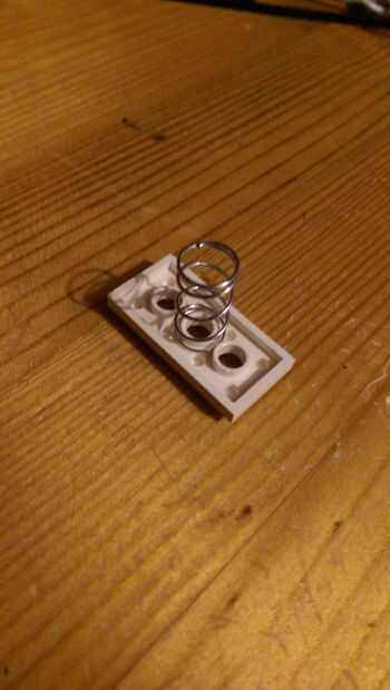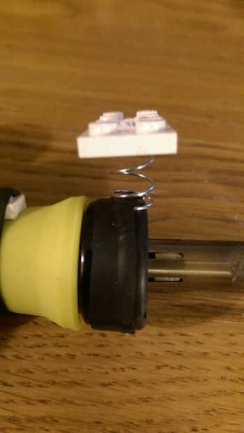 A continuación necesitamos facilitar el gatillo, muerto como el resorte que encajan perfectamente en la parte inferior de la pieza de lego. Realmente utilicé un par gotas de soldadura para mantener en su lugar pero podría llegar lejos sin hacer que, como una vez lo tendría lugar en lugar por el marco