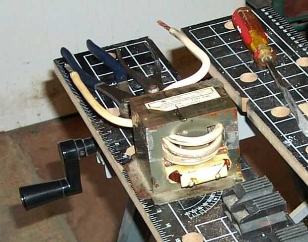 Teoría del transformador es un poco más allá de mi capacidad para escribir sobre. Hay muchas fuentes en la red si usted está interesado en este tema. La idea es tener 3 o 4 bobinas en el nuevo secundario. Esto producirá en algún punto entre 3 a 6 voltios. Me mide 2.5 cuando enchufé una prueba rápida. La parte inferior los voltios, los amperios de mayor. Esta es la razón principal que se utiliza tal un pedazo grueso de alambre.