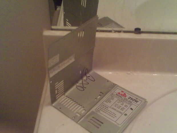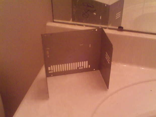 Aquí utilicé un caso más moderno. Necesita aplanar hacia fuera y el doblez en ángulo recto. Ahora necesita perforar cuatro agujeros lo suficientemente grandes para dos perchas por agujero.