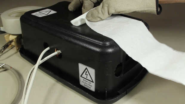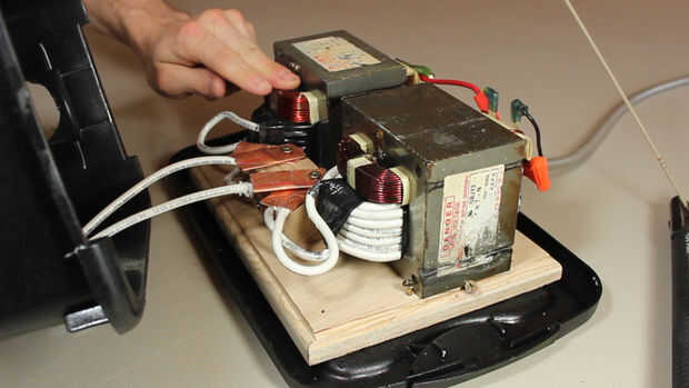 Probablemente no usar esto para soldar con 3/32" sobre una base regular, pero para combatir el calor extra, utiliza un ventilador, rescatado de una de las microondas y había colocado hasta un agujero de ventilación en el lado de la cubierta de la soldadora. Esto sopla el aire sobre los serpentines y expulsa el aire por el otro lado.