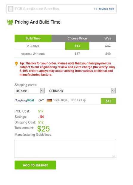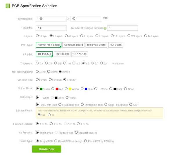 Luego basta con ir a http://www.pcbway.com/orderonline.aspx . (Esta es la ficha de "PCB cotización instantánea" en su página web) Tipo de dimensión de tabla (100mmx60mm) y cantidad (más barato es 10). Resto de las opciones no necesitan ser cambiadas. Por supuesto, puede cambiar el color de la máscara de la soldadura (color del tablero) o la serigrafía (texto en las tablas) a lo que te gusta. Esto no afecta el precio. Puedes ver cómo se suele parecer en la foto.