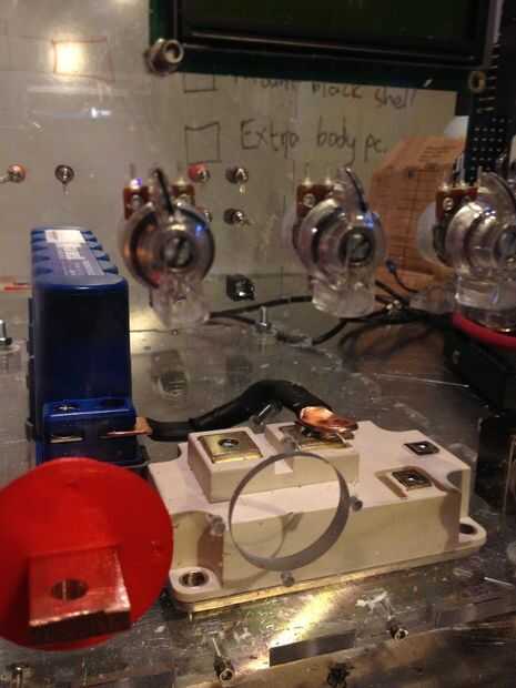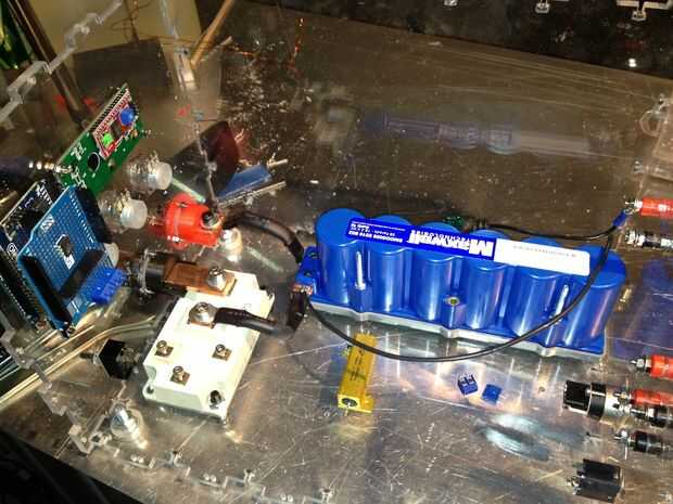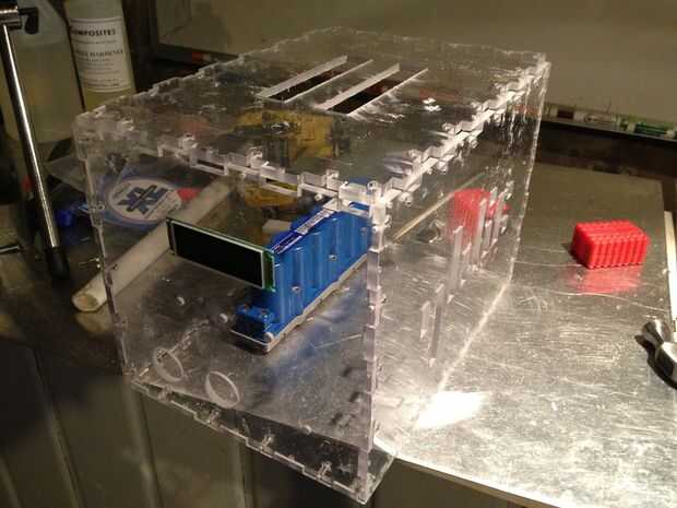 El soldador tenía su trazado de circuito diseñado y probado antes el diseño para que sea usuario amistoso. Con Solidworks, un programa de CAD 3D fueron capaces de diseñar la caja usando ¼" lexan y debido a la flexibilidad de CAD, pude agregado en los agujeros de montaje y elementos de usuario como un mango. Utilizando los archivos DXF generados por el modelo de Solidworks, que entonces utilizamos el chorro de agua OMAX en el Departamento de ingeniería mecánica para cortar el caso. Las conexiones del electrodo de cobre rojo y negro personalizado se diseño en Solidworks y fueron luego 3D impresos para su uso en la soldadora.