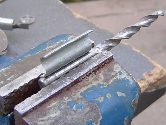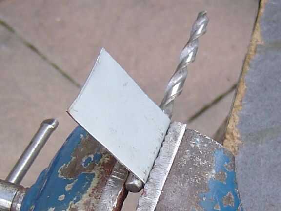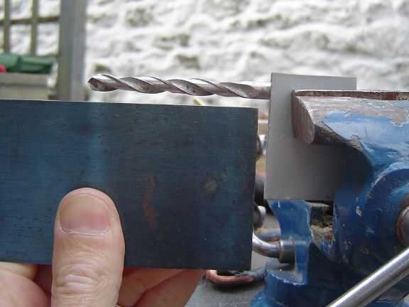 Hacer las pinzas para conectar los cables. Estos están hechos de acero. Cortar un trozo rectangular la misma longitud que la anchura de las tiras el transformador secundario y lo suficientemente amplio como para sostener las dos horquillas de alambre de unos 4mm pernos entre ellos, además de un poco más. Forma el lado largo doblándola alrededor de la espiga de una broca (yo usé 5mm) para hacer un semicírculo escaso, y doblar hacia atrás contra la mandíbula del vicio. Sacar y dar vuelta alrededor, hacer otra curva en el vicio 4 o 5 mm de la primera de ellas, entonces forma el resto alrededor de la broca de corona otra vez. Haga dos orificios en la parte media para alinearse con los agujeros perforados en la pata de la bobina del transformador. Hacer una segunda abrazadera lo mismo, pero esta vez puede perforar primero y utilizarlo como una guía para donde perforar los agujeros en la bobina.
