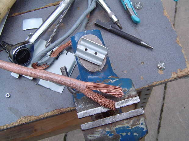 Ajuste los electrodos en lugar si usted no lo ha hecho, inserte los extremos de los cables en ellos, colocar las arandelas y las tuercas y apriete firmemente. Puede que necesite un poco de archivo las arandelas para fijar las tuercas de retención. Alimentar el alambre inferior a través del agujero en el bloque inferior antes de conectarlo.