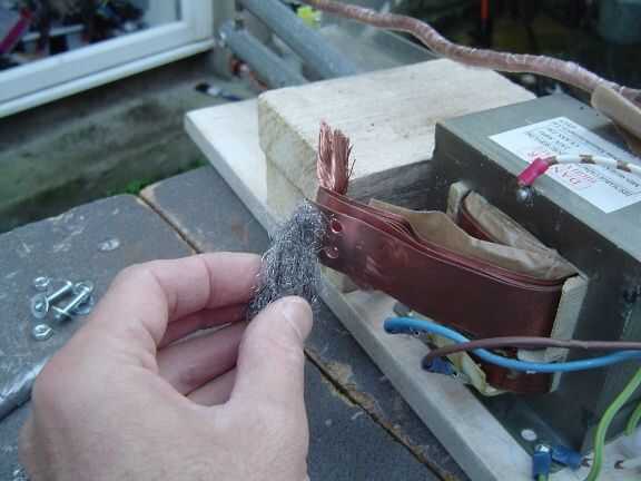 Tome la cinta de los extremos de los cables y utilizar las abrazaderas hechas para conectar al transformador. Ajuste la cabeza del tornillo quede al lado de una lavadora, al lado de la parte posterior de la bobina, entonces el cable va en contra de la parte delantera de la bobina y luego fije con abrazaderas, luego dos más arandelas por perno, luego las tuercas. Apriete tanto como puede y vuelva a apretar después de la primera pocas soldaduras. Utilizar lana de alambre para asegurarse de que cada capa de la bobina es agradable y brillante a ambos lados antes de conectar el cable y los hilos son agradables y limpias también.