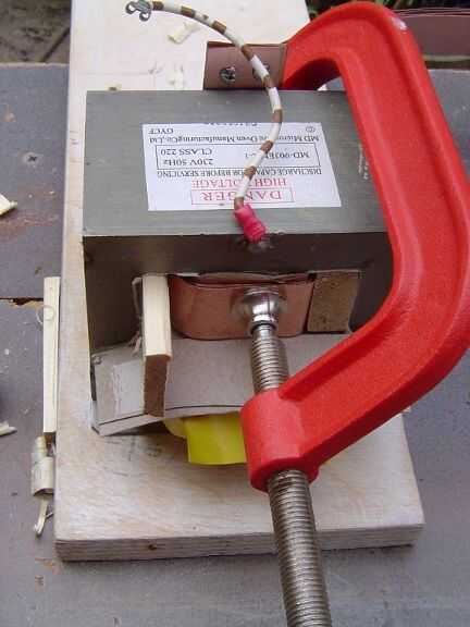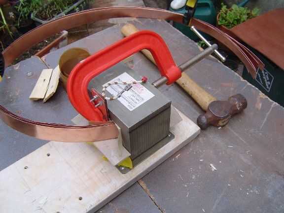 El montón de tiras a un lado de la base, con una capa de aislamiento debajo de ellos, la alimentación y la pierna a ras contra el centro de la abrazadera. Cuña firmemente las tiras hacia el lado con alguna madera plana (esto es importante para evitar el arquear de las vueltas) y las tiras, uno a la vez, por el otro lado de la alimentación. Quite la abrazadera (la madera debe mantener el cobre en su lugar) y empezar a estirarlas firmemente contra la base donde salen. Alimentación por el otro lado de la base y terminar la curva apretada que empezaste, martillando suavemente la bobina hacia abajo.