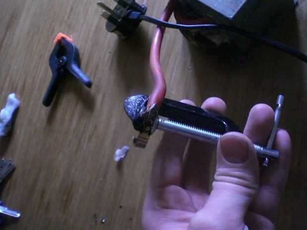 Note que los electrodos de manera se fijan al cable. Es manera y toma algunos presentación (afilado de puntas de los electrodos) - puede quemar sus dedos durante la operación-guantes necesarios más básicos!! Mal la próxima vez prueba a hacer una armadura para la alineación correcta de los electrodos.