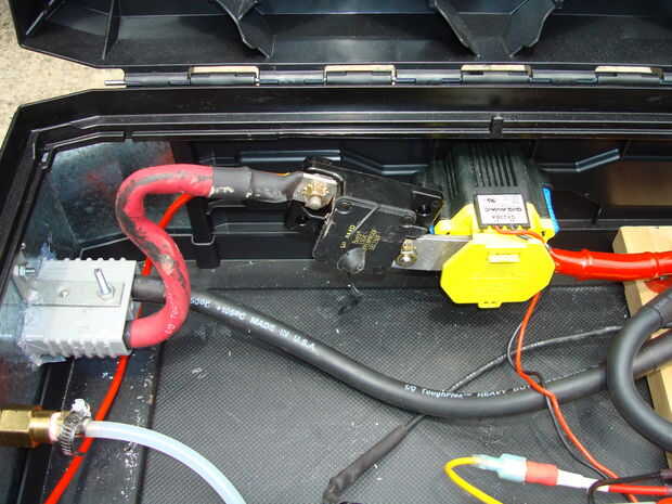 El cable negativo (dentro de la caja de herramientas) se conecta directamente en el conector de entrada de SB175 [-], a la terminal negativa final, como todos la conmutación de varios se hace vía el cable positivo. El cable positivo se conecta desde el conector de entrada de SB175 [+], a un interruptor de circuito de 150amp que está conectado directamente con el contactor con un pequeño pedazo de acero que cortado a la medida. El contactor, luego se conecta al borne positivo final. Cometí el error de conectar el contactor a la caja de herramientas antes de averiguar la mejor colocación para acomodar el cable de calibre 1/0, por lo que verás en la imagen que mi cable positivo desde el conector de la fuente tiene una curva de S, porque tratando de la longitud de cable personalizada 1/0 al tamaño exacto del tamaño habría sido complicado. Si hubiera esperado para montar el contactor en el ultimo paso, pude han tenido más flexibilidad en el dimensionamiento de las longitudes de cable.