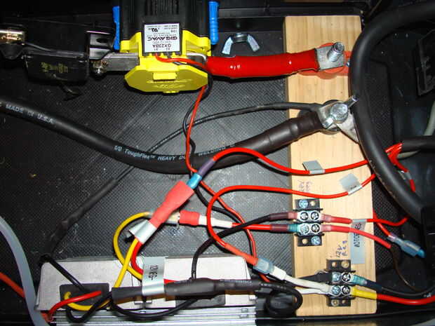 También instalé una tabla de 1 x 3 que corté a la medida que se cuña en la caja de herramientas donde se montar las conexiones. Usé 2 bloques de terminales de dos posiciones de Radio Shack. Uno es 12V para las bobinas, y la otra es 24V para el motor. También se utiliza dos terminales grandes de alto amperaje que representaba la carga positiva y negativa.