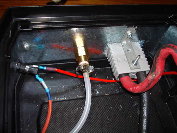 Era sólo cuestión de encontrar un conector hembra gas que encajaría en el regulador de gas que vino con mi original AC powered soldador. Para mí fue un 3/8" conector hembra de FIP que comprar en el Departamento de fontanería de Lowes. Mejor toma tu regulador en Lowes con usted y encontrar el conector hembra se adapta. Ya que yo me este montaje en la pared lateral de la caja de herramientas, he comprado un conector de 3/8" FIP hembra, con un conector macho de 3/8" en el otro extremo, por lo que podría utilizar un conector hembra/hembra dentro de la caja de herramientas para colocar el conector firmemente a la pared lateral. Luego compra un hombre-2-lengüeta de montaje y utiliza una aerolínea semirrígida que también comprar de Lowes.