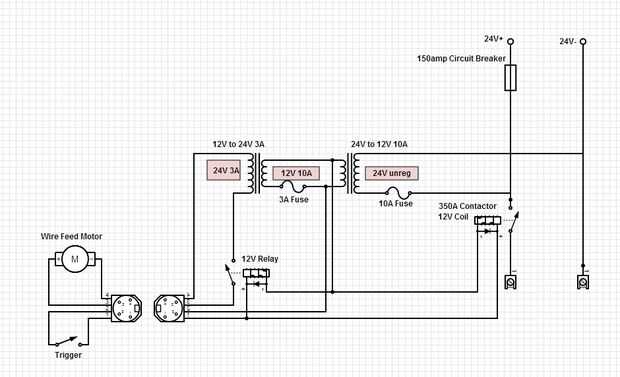 También hay un relé adicional que controla el motor de accionamiento en el spoolgun que avanza el hilo. El motor de la Lincoln spoolgun está etiquetado a 24V, pero el contactor que ordené utiliza una bobina de 12V. El fabricante del contactor que estoy utilizando, Gigavac, tiene modelos de bobina de 24V, que serían simplificar el circuito, pero el proveedor de que ordenó ofrece solamente el modelo de bobina de 12V. También me gusta la idea de utilizar las dos fuentes de alimentación de regulador de voltaje para que el voltaje al motor spoolgun se reglamenta. Posiblemente excesiva, pero mejor seguro que lo siento.