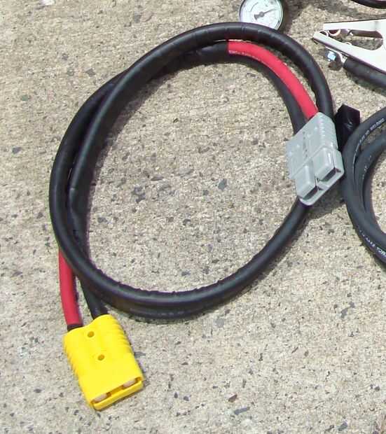 En segundo lugar, usted querrá crear un cable de conexión al conectarse la máquina sí mismo de baterías/vehículo. Fui con dos longitudes de 5 pies del 1/0 soldadura cables con un conector SB175 en ambos extremos. Una cosa he aprendido: todos los colores SB175 son intercambiables excepto los amarillos. Originalmente usé un conector amarillo para la conexión de mi vehículo, pero cuando pedí más, decidí probar otros colores, que es como descubri que conectores amarillos sólo conectan con otros conectores amarillos. Al final Esto funcionó hacia fuera bien, como el cable que hice tenía un conector amarillo en un extremo y un conector gris en el otro.
