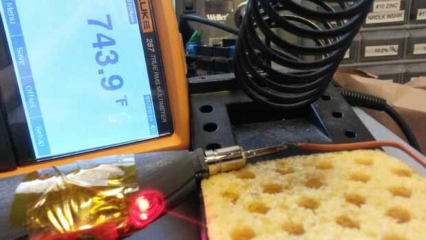 Solderdoodle solo enciende deslizando el interruptor de seguridad y presionar el resorte cargado botón, había grabado hacia abajo y deje con un sensor de temperatura de tocar la punta. Tomé fotos de la prueba y trazan en un gráfico, que se muestran arriba. Se puede ver que la temperatura está por encima de 700ºF para una hora completa y sólo comienza a declinar después de 1 hora 20 minutos. La batería está completamente agotada después de 2 horas. Bajo uso normal, el botón de encendido no está sostenido por tanto tiempo, así que debe durar mucho más tiempo durante el uso normal.