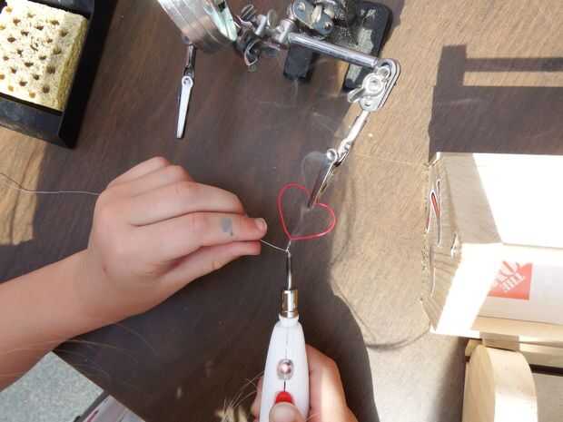 Simplemente corte el alambre segmentos de 3 o 4 pulgadas para iniciar (se pueden cortar tiras más largas también si es necesario). Tira de los extremos del alambre sobre. 2" con el pelacables de la herramienta y colocar cada trozo de alambre en cada clip de la tercera mano. Torcer y doblar los alambres en a forma para crear un montón de diseños como estrellas, corazones y hasta figuras de palo! Puede utilizar cualquier soldador para hacer esto, pero me parece que el Solderdoodle es más conveniente. Que te diviertas soldadura alambre arte!