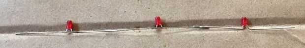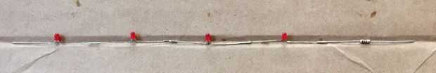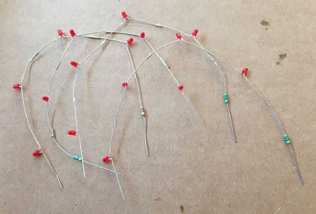 Para cada mitad de cada flip-flop, habrá cuatro LEDs soldadas en serie (en una fila) con una resistencia limitadora actual. He utilizado LEDs de 3mm de color rojo en este ejemplo, y el resistor limitador actual se calculó en cerca de 150 ohmios. Esto conduce bastante brillantes.