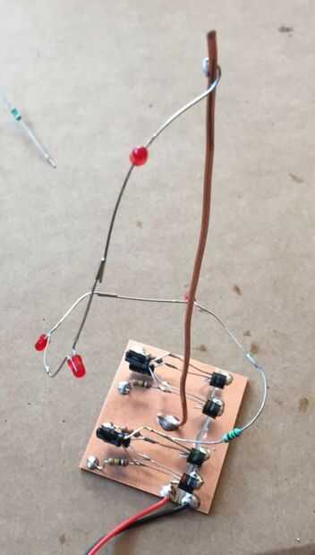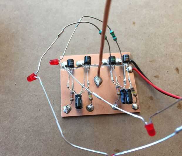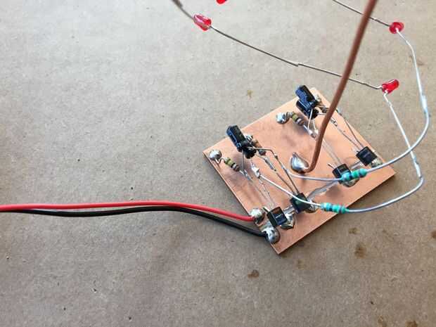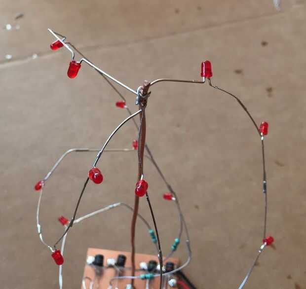Una vez que cuatro cadenas de cuatro LEDs, puede soldar a los transistores. Utilice el extremo de la resistencia de cada cadena de LEDs. Comience con uno de los internos para que sea más fácil más adelante - estos se sueldan a los colectores de los transistores - generalmente en el lado opuesto a los emisores, y los que tienen solamente un capacitor soldado a ellos. Los LEDs de la curva en forma de espiral hasta el árbol y hacer un pequeño bucle con nariz de alicates en la parte superior para sujetarlo a la parte superior del árbol. Luego de la soldadura de la siguiente cadena de LED, flexión alrededor de uno. Terminan en forma de hélice alrededor de la otra. Esta es un área donde puede ser mucho más creativos. Sólo asegúrese de que ninguno de los alambres toquen. Como se señaló antes, si el LED no tiene cables largos, siempre puede acortar el árbol.
