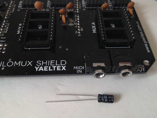 El representatividad electrolítico puede ser uno de los componentes mas altos de todo el Kilomux, y por eso lo dejamos el de párrafo final. Aunque los capacitores electrolíticos sí tienen polaridad, su soldadura es muy sencilla.
