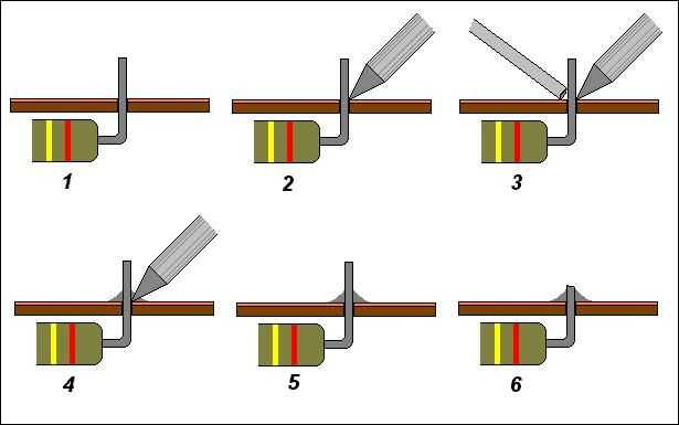 - Coloca la punta del representatividad o cautín de manera tal toque los dos elementos a soldar: la placa electrónica y la "pata" del componente. (1 segundo)