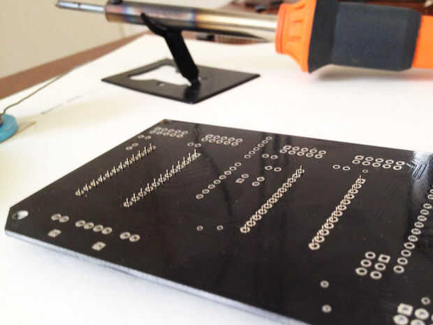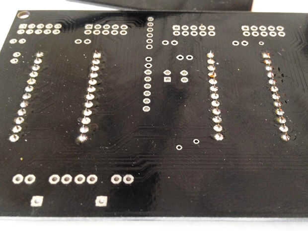 - Da vuelta la placa y presiónala para hacer los zócalos queden totalmente pegados a la placa. Si quedan levantados, podemos dañar la unión al hacer fuerza para colocar el integrado en el zócalo. Al estar pegado el zócalo al PCB, la fuerza hagamos no descarga sobre la soldadura, si no sobre la placa.
