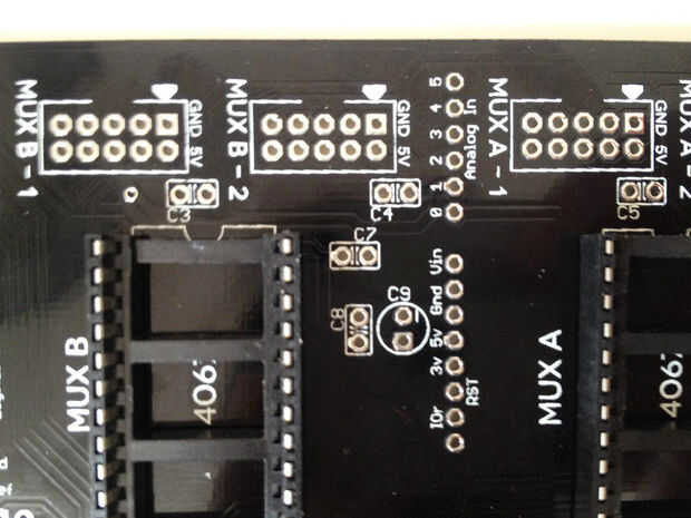 - Coloca cada condensador en su lugar y dobla sus patas del otro lado de la placa para evitar se caigan. Las zonas indicadas están marcadas con una forma rectangular y debes colocarlos en los lugares: C1, C2, C3, C4, C5, C6, C7, C8 y C10. C9 es el condensador electrolítico y lo soldaremos luego.