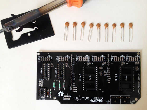Los capacitores cerámicos son el siguiente componente en altura y su soldadura será muy similar a la de las resistencias y el diodo zenner. Los capacitores cerámicos, al igual las resistencias, no tienen polaridad. Eso significa el sentido en el los coloques es indistinto.