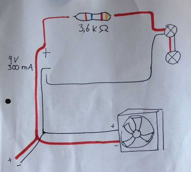 -el positivo va al interruptor y sale el interruptor, luego un cable se conecta al cable positivo del ventilador y a los 3, 6 resistencia de ohmios k entonces deja la resistencia en el lado positivo en el LED.