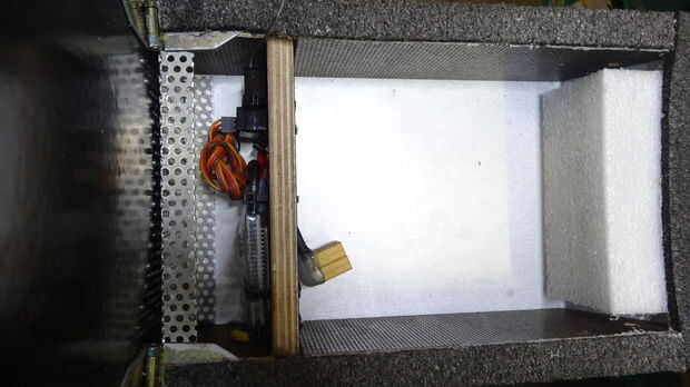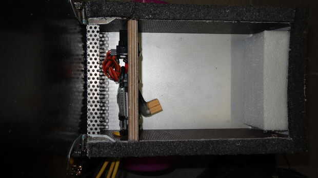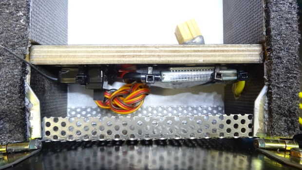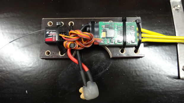 Una vez completado el cuadro, tienes que conectar la electrónica. Para eso utilicé la madera contrachapada de 9mm dentro de la caja. Perforé algunos agujeros, que he podido conectar el ESC y el receptor con Zipties.