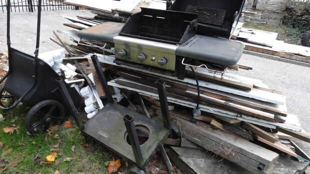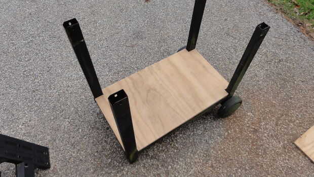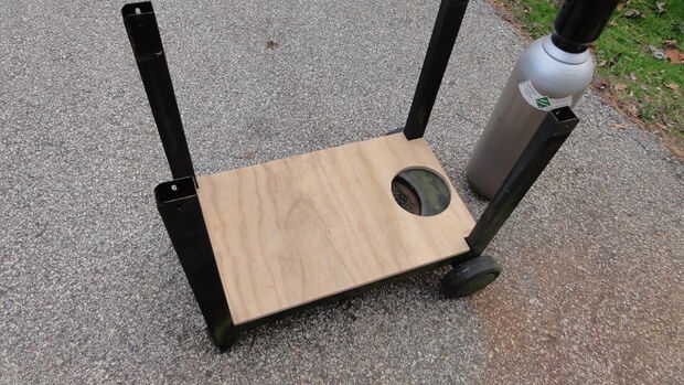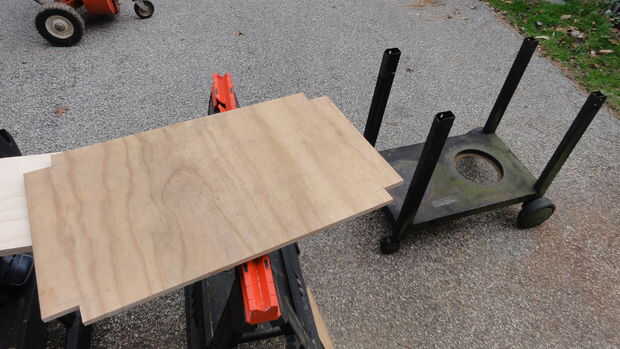 1/2" pieza gruesa de madera contrachapada de chatarra se ajustó sobre el estante inferior para cubrir el orificio grande. Un agujero más pequeño (6" de diámetro para el depósito de 7 1/4" de diámetro) fue cortado de la madera contrachapada para descansar la parte inferior (redondeada) de lo tanque de gas de soldadura en.