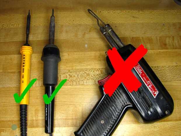 Para soldadura electrónica, usted necesita una soldadura de hierro, no un soldador pistola. Pistolas de soldaduras están diseñados para proyectos grandes y voluminosos como el tubo de cobre o canales. Son demasiado imprecisas y demasiado poderoso para soldaduras delicadas. Además, trabajan por poner corriente directamente a través de la punta, y esa corriente podría dañar potencialmente sensibles semiconductores.
