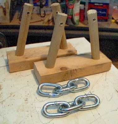 Poner las piezas de espiga en los agujeros perforados en el 1 x 2. Perforó un pequeño orificio en el extremo de cada pasador. Cortar dos trozos de cadena con tres enlaces en cada pieza. Los enlaces no deben ser ningún menos de lo que usted ve aquí. Ya podría ser un poco mejor. Esto es lo que tenía en mis materiales sobrantes.