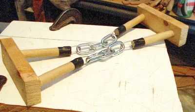 Cuando haya terminado de colocar la cadena a los extremos de la espiga, esto es lo que tienes. Hice un error que se puede ver. La cadena más cerca de la cámara tiene un giro de 1/2. Más tarde tuve que desconectar la cadena en un extremo y eliminar el giro.