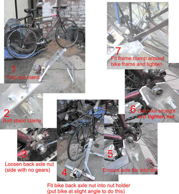 Afloje la tuerca de 15mm de eje trasero de bicicleta del lado sin engranajes (3). Baje de la moto en el soporte de modo que la tuerca en el lado del engranaje encaja en la sección de caja soporte tuerca (4). Esto se realiza mejor en un ligero ángulo y luego la bicicleta alrededor de la torcedura, pero encontrar su propia técnica. Al otro lado del eje trasero debe encajar en la ranura que usted ha hecho.