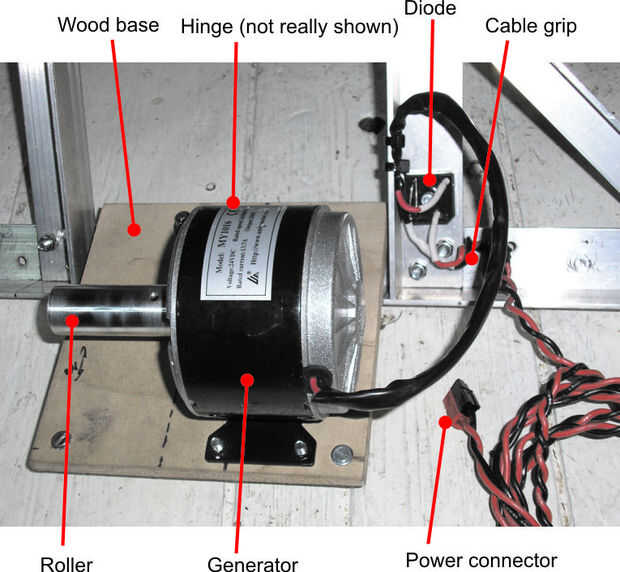 El rodillo debe presionarse sobre la rueda trasera de bicicleta con suficiente agarre para que el generador se convierte. Para ello algún tipo de elástico se usa para mantener el generador sobre la rueda. Elástico de tienda aro fue utilizado en este caso, pero cuerdas de amortiguador auxiliar también podría ser utilizados y puede ser más durables.