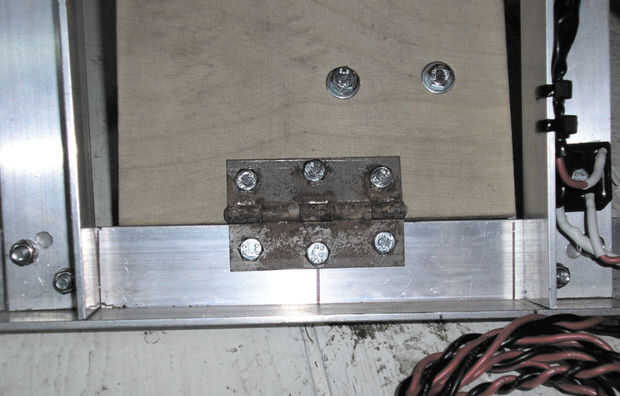 Corte la pieza de madera contrachapada con el tamaño correcto para poder caber en el espacio en el marco. En el caso fue alrededor de 150 mm x 150 mm agujeros para la bisagra y el generador. El generador ha aprovechado los agujeros para los pernos de 6mm. también se utilizaron pernos de 6mm para la bisagra.